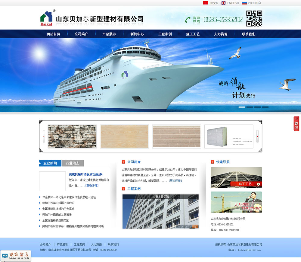 山東貝加爾新型建材有限公司,創建于2012年,是中國外墻保溫裝飾行業的新星企業。公司前身俄羅斯海達公司成立于2006年,主要生產彩鋼瓦,是中國最早入駐俄羅斯的生產型企業。一直以來,我們始終致力于高品質、高性能建材產品的技術創新,注重采用國際先進裝備為廣大客戶生產優質的產品。我們一直關注國內裝飾保溫一體板的技術導向及市場需求,經過多年的技術研發和對國內外尖端設備的考察考核,“貝加爾墻板”已經成功面世?!柏惣訝枆Π濉睒I已通過了國家質檢部門的質量檢驗,政府準發了全國節能產品推廣證書,并獲得了多項由國家專利局頒發的實用新型專利證書,擁有歐洲CE認證和俄羅斯質量防火認證。短短的時間內,該產品大量出口俄羅斯、中亞、韓國、蒙古、伊拉克、維多利亞等地區,在國內已經擁有多處樣板工程。
